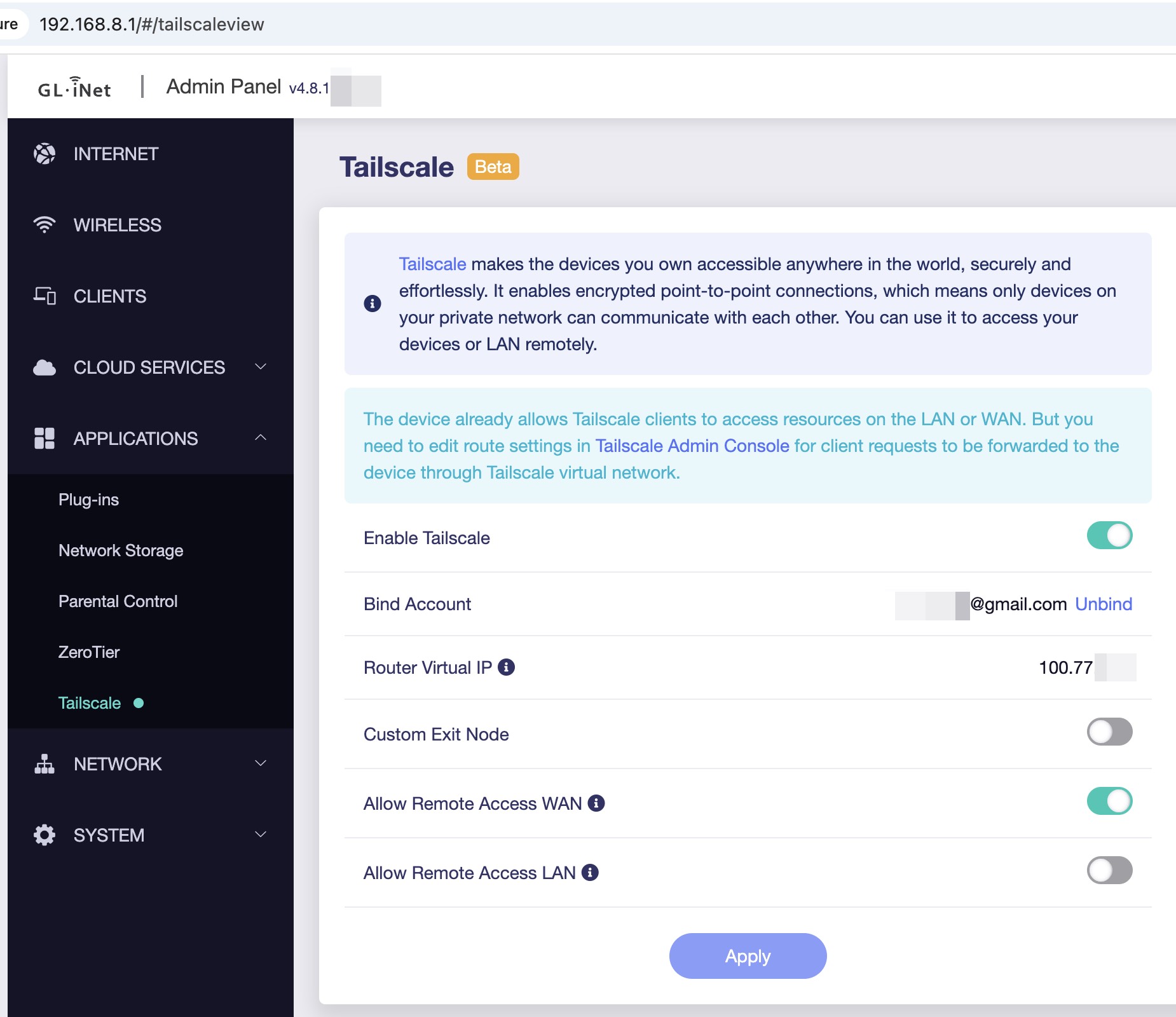 Then on your iPhone (or any other device in the Tailscale app), just connect through your router — it will route internet traffic via the GL-iNet exit node.