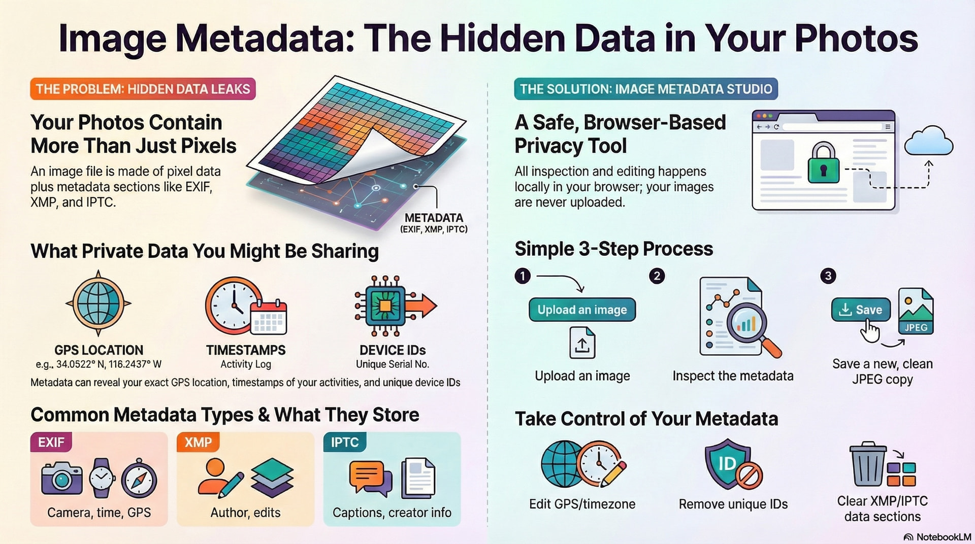 It reads EXIF / XMP / IPTC straight from an uploaded image in the browser (no backend upload), shows everything in clear key/value tables, and for JPEG images it can remove or edit privacy fields and let you download a new image with the same pixel data.